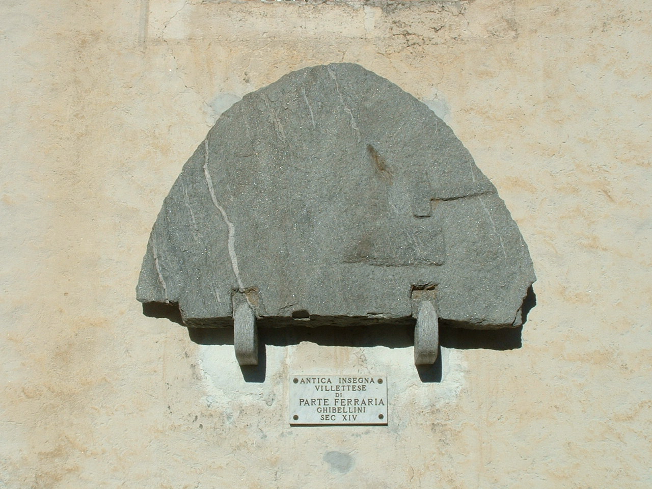 - due lastre di granito, a lunetta, con le insegne di parte ferraria, l'incudine, la tenaglia e il martello; i Ferrari, come dice il loro nome, lavoravano il ferro, erano fabbri;